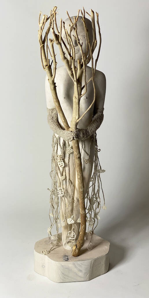I'm a tree II - brons, vintage linnen, borduurwerk - 89x27x31 cm