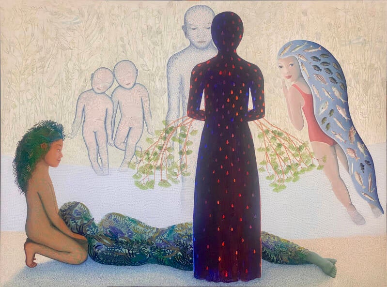 Mare, acrylverf, collage papier op linnen, 40 x 60 cm (the fish protector ) sold